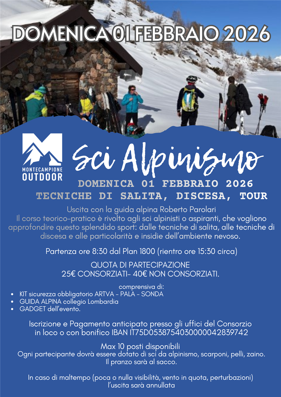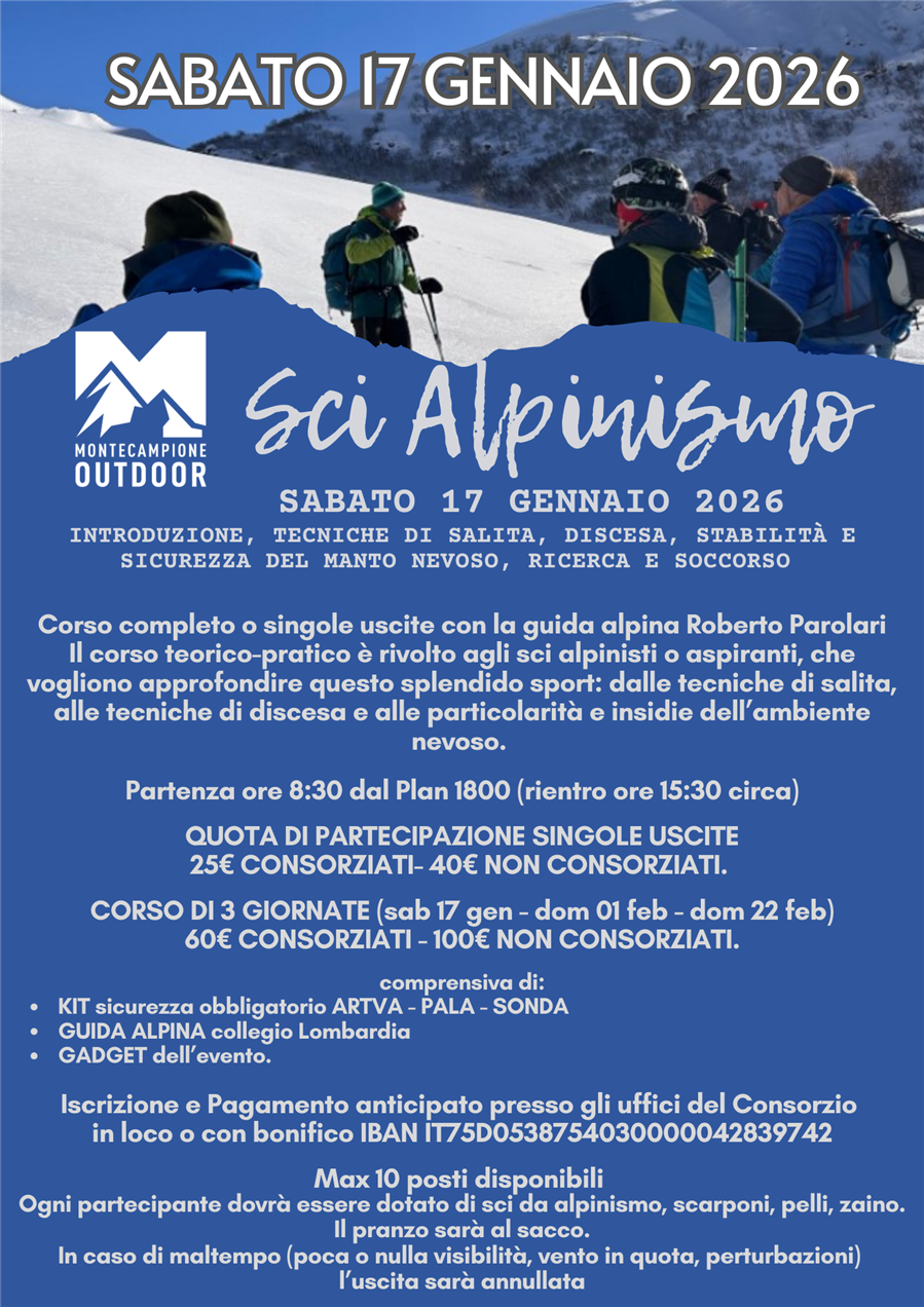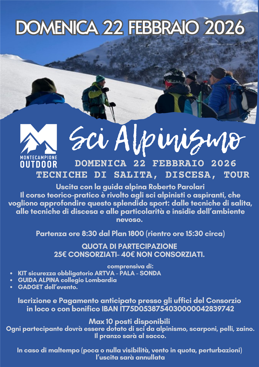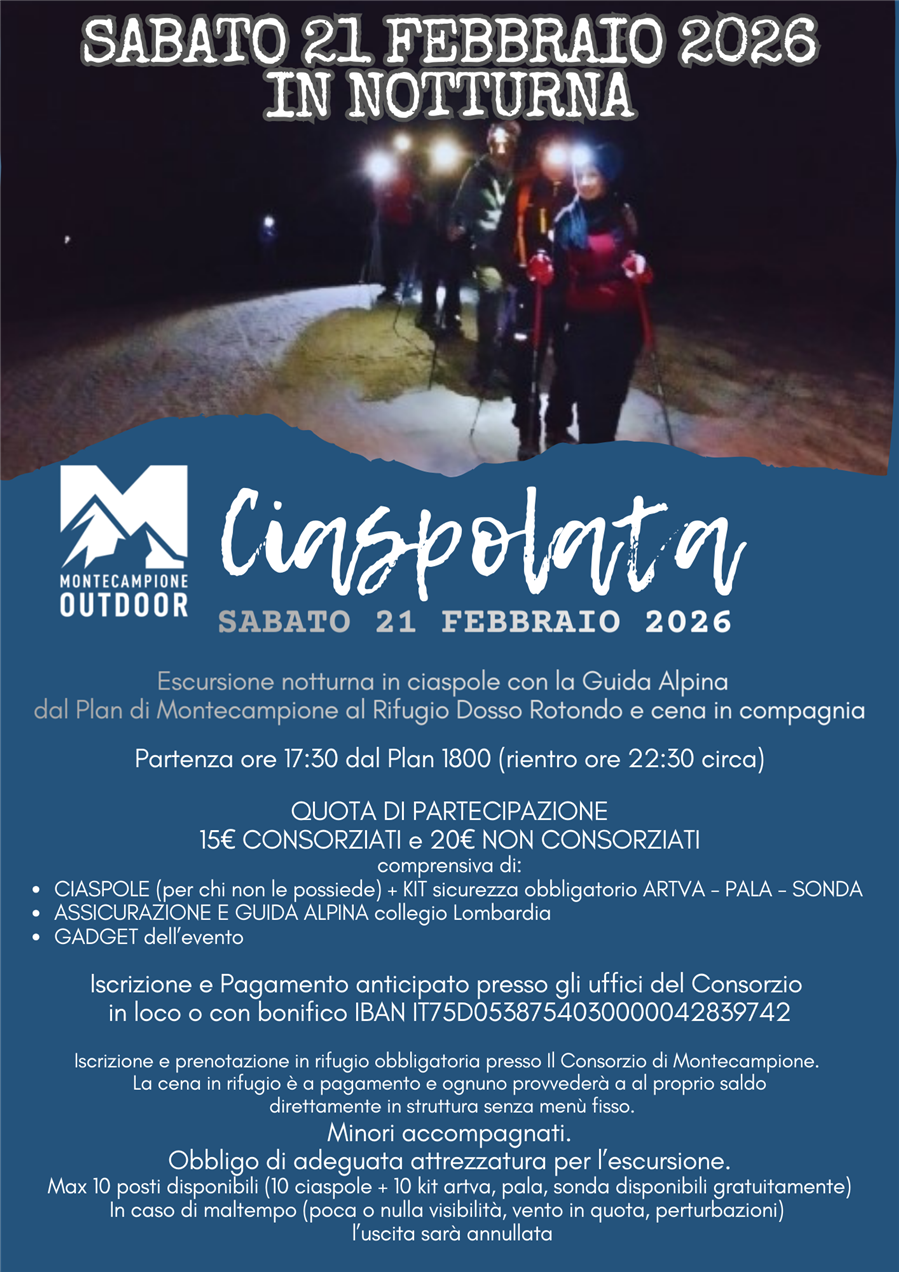 Iscrizione e Pagamento anticipato presso gli uffici del Consorzio di Montecampione in loco o con bonifico IBAN IT75D0538754030000042839742