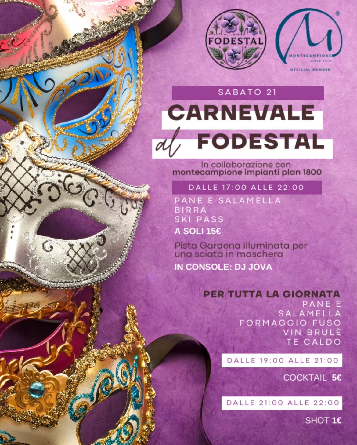 - CARNEVALE AL FODESTAL organizzato dal Bar Fodestal sabato 21 febbraio: per tutta la giornata pane e salamella, formaggio fuso, vin brulé e the caldo. Alla consolle DJ JOVA. Cocktail €5 dalle 19-21 e shot €1 dalle 21 alle 22. Inoltre: in collaborazione con la società Plan 1800 srl, promozione dalle 17 alle 22 'pane e salamella, birra e ski pass' ad € 15.00, con pista Gardena illuminata per una sciata in maschera.